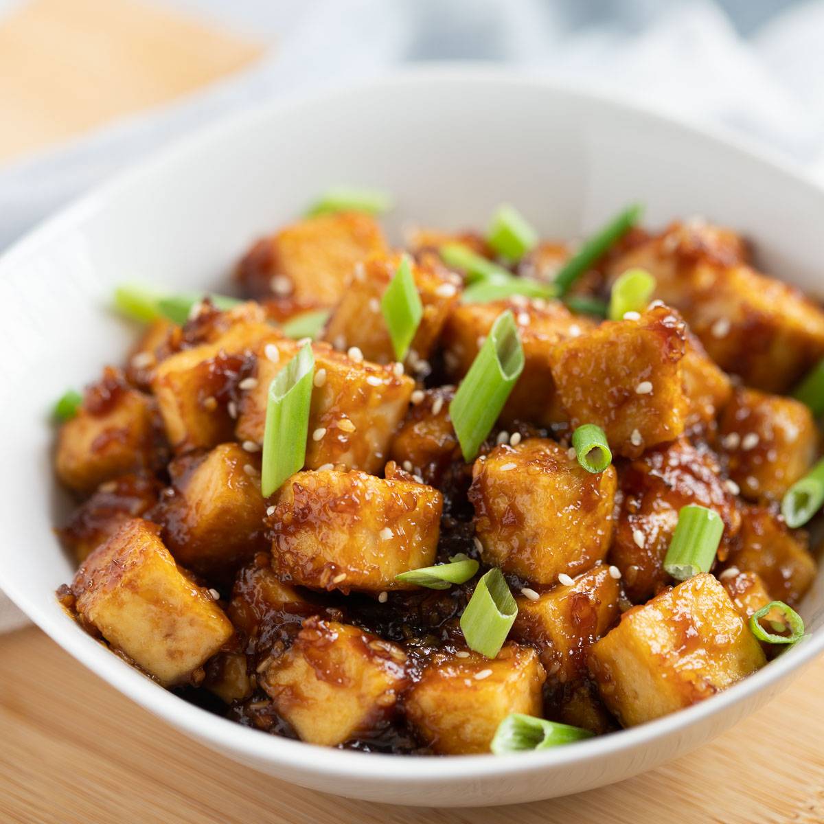 The key to crispy pan-fried tofu is tossing it in corn starch! This recipe is simple to make and comes out perfectly golden on all sides. Served with a quick sticky teriyaki sauce that perfectly coats the tofu and is topped with fresh scallions and sesame seeds. Itβs out of this world delicious!
