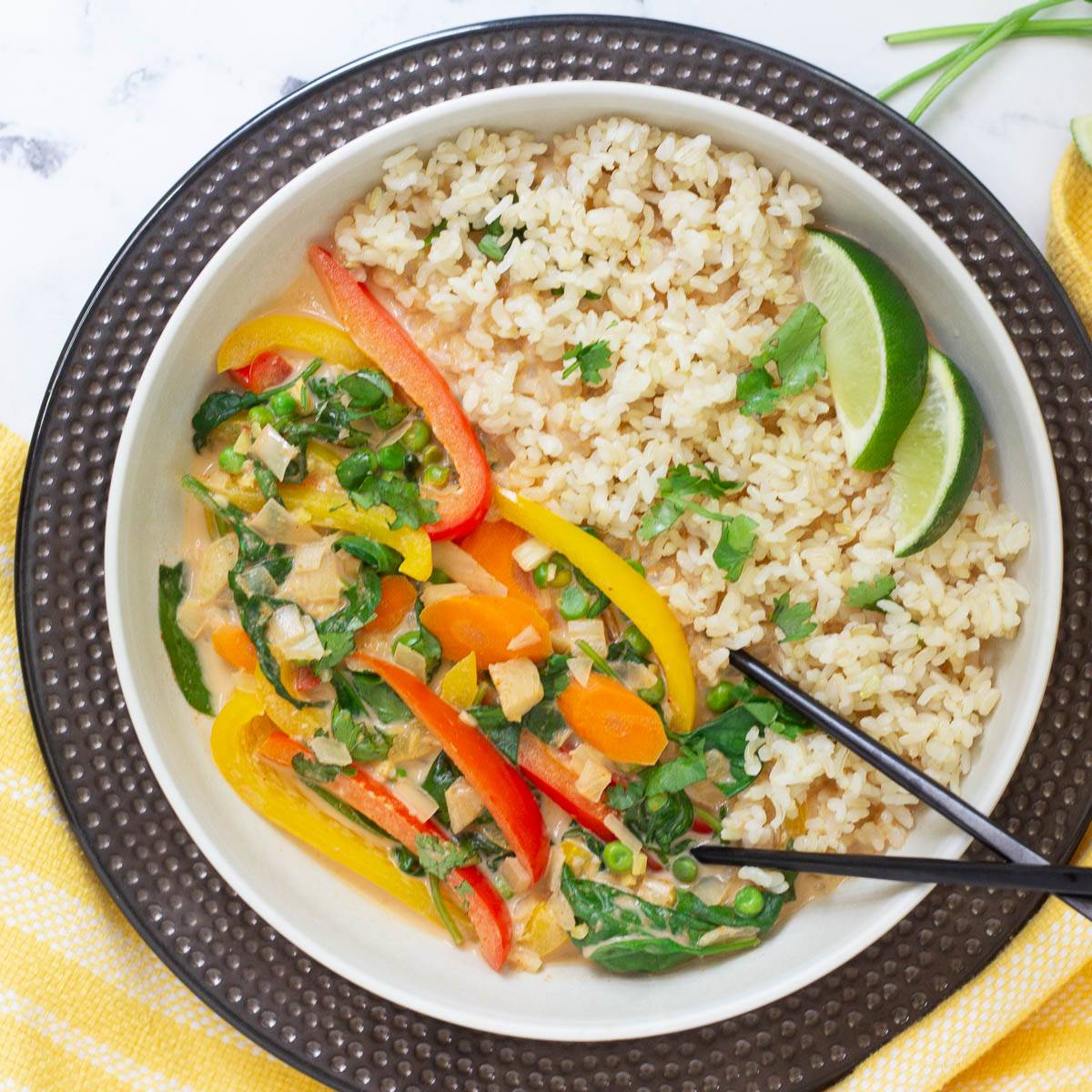 This Vegan Thai Red Curry is simple to make, and WAY healthier than take out! Made with a combination of vegetables with spicy red curry in a creamy coconut milk sauce, it’s served alongside Jasmine rice and topped with fresh herbs! Ready in 30 minutes, it’s a quick and healthy weeknight meal!
