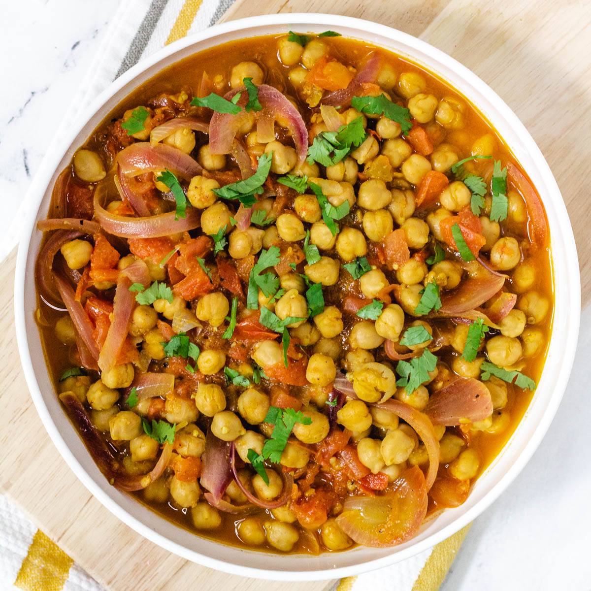 This simplified Chole Masala recipe, a popular Northern Indian chickpea dish, is cooked in a thick and spicy gravy. It’s ready in thirty minutes! Wholesome, vegan, and gluten-free. Serve with basmati rice and cilantro!